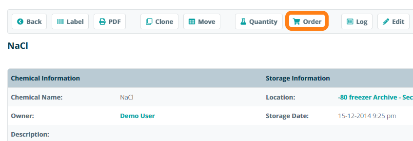 Alternatively, users can also link a sample to a catalog item by clicking the Order button in the toolbar on the sample information page.