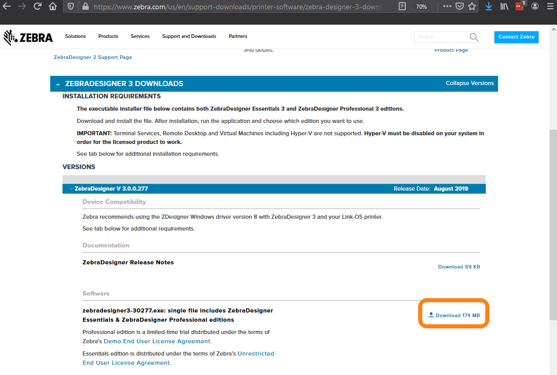 Go to the zebra website (this link opens in a new window) and download the ZebraDesigner. If you have not installed the Zebra printer download and install the latest version of the Zebra printer software before continuing with installing ZebraDesigner.