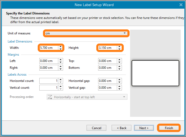In ‘Label Dimensions’ change the Label width and height according to your labels. In this example, we use the Zebra 2000D / 1000T labels. The ‘Unit of measure’ can be changed in the lower right corner of the screen. When dimensions are set click Finish.