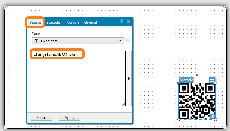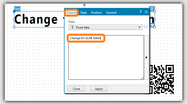 Go to the tab Source and change the text to Change for eLAB QR Token