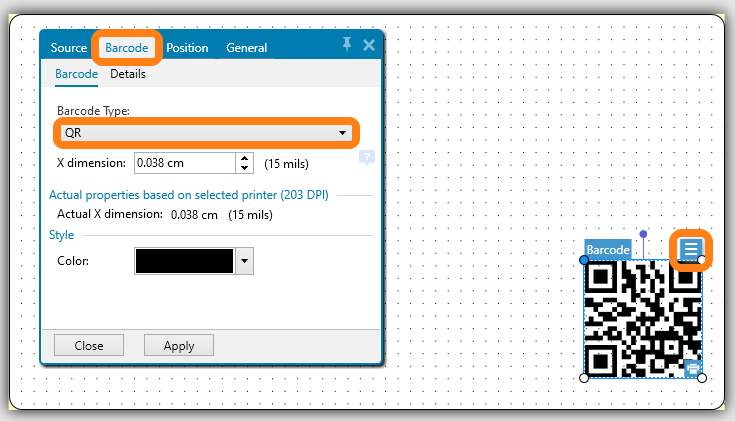 Click on the menu button on the label and go to the tab Barcode select Barcode Type QR