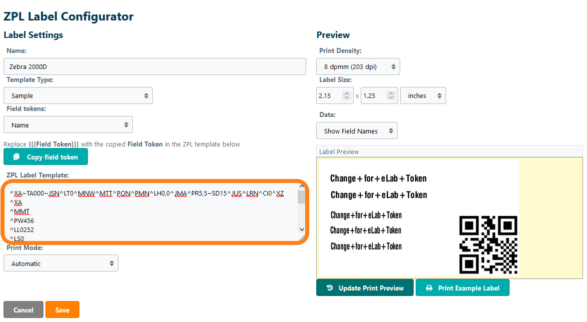 Do this for al the other fields and click Update Print Preview. (When the label is upside down, you want to repeat al steps and change the setting print rotation in the beginning.) If you are done click Save. This label template can now be used in eLabJournal to print labels with a Zebra printer.