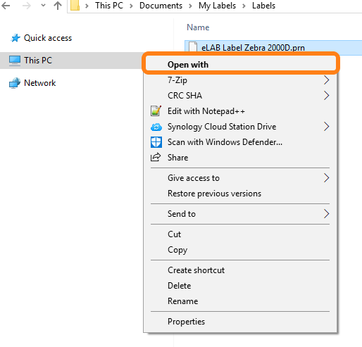 Leave the screen above open and go to the map of your .prn Zebra label, this folder is found in ‘Documents’ if not changed during installation, and click with the right mouse button on the label, select Open with