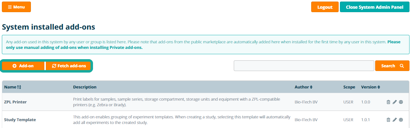 To mange the add-ons added to your system, navigate to add-ons the system admin panel. All add-ons available in your eLabJournal Private Cloud or On-Premises installation are listed here. For every add-on you can find the following information: