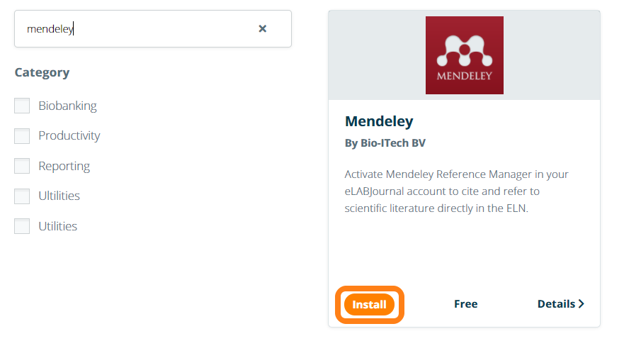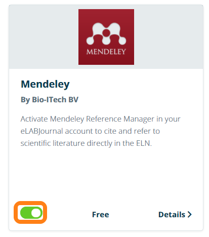 Link your account of the Reference Manager Mendeley to your eLabJournal account to cite and refer to scientific literature directly in the ELN with the Mendeley add-on. Install the Mendeley add-on from the Marketplace.