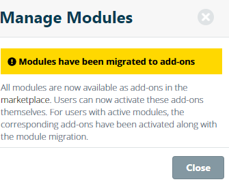 Important Notice: All Modules have been migrated to add-ons. If your organisation activated has activated Marketplace, module activation is no longer required here. All modules have been migrated to add-ons and are now available in the Marketplace for all users to install.