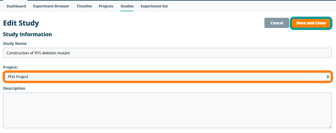 Studies Move Studies To move a study to another project, navigate to Studies and click Edit. Select the project where the study should be moved from the Project dropdown. Click Save and Close to save the changes.