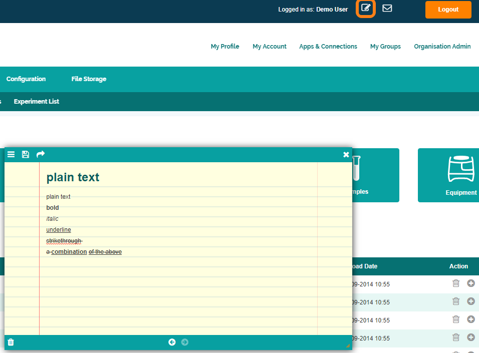 Enter the note and use basic formatting to set the styling of the note content. Click Save to store the note. The first line of the note will automatically be set as the title of the note.