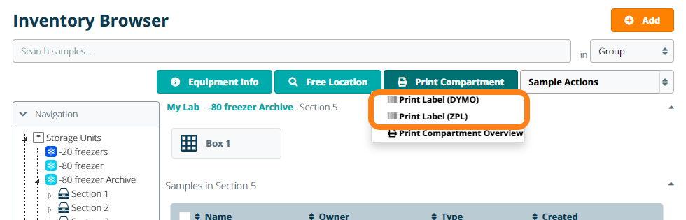 To print a compartment barcode, navigate to Inventory – Inventory Browser and select a storage unit or compartment from the navigation tree. Click the Print Compartment button and select the Print Label option from the dropdown. Note: this option is only available if you have enabled the DYMO LabelWriter or ZPL Printer add-ons in the Marketplace.
