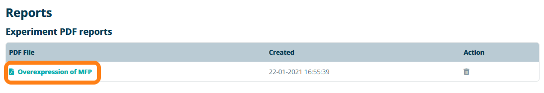 You will be redirected to the Report Files page, where the PDF will be added to the list of generated reports. You can download the PDF by clicking on the experiment name. Experiments with a large amount of content may take additional time to compile, during which you may navigate away from this page and continue working in your lab notebook until the PDF report is ready to download.