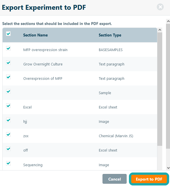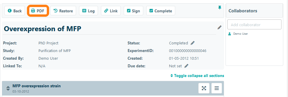 You can print experiment from your electronic lab notebook to a PDF file. Open the experiment you want to export and click on the PDF button.
