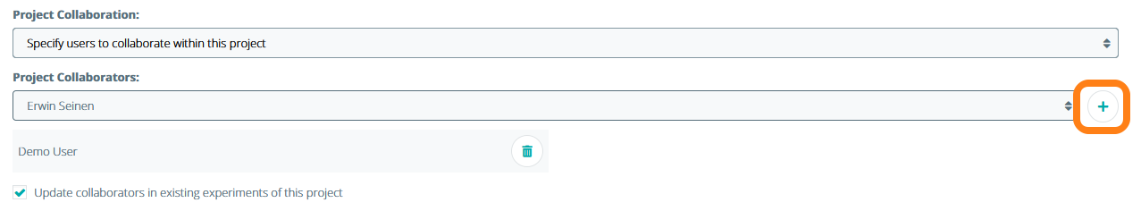 The selected users will also be added as collaborators to existing experiments in the project, unless the corresponding option is unchecked. Note that when collaborators are set on the project and the study level, the project collaborator setting is overruled.
