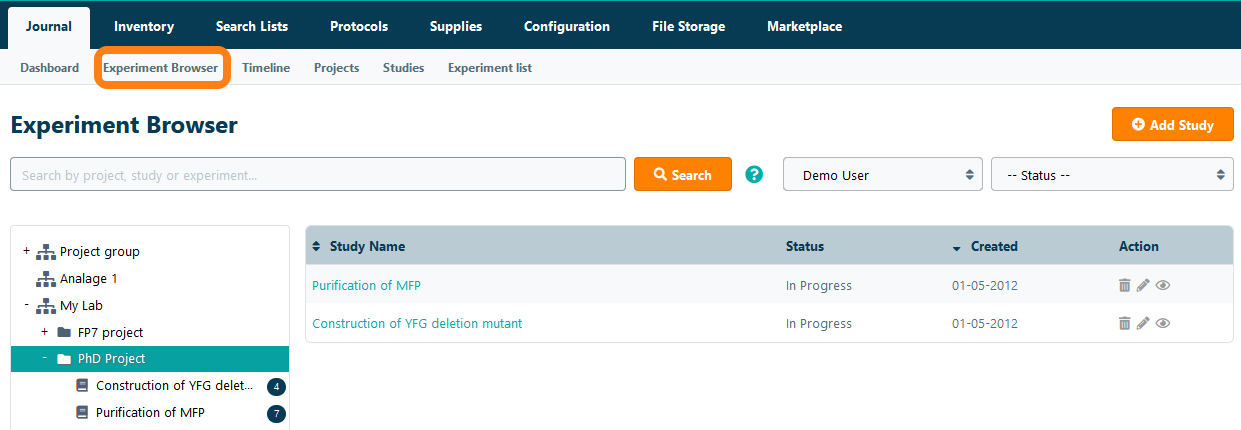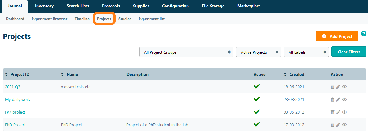 Experiments are organized by projects. Each project can contain multiple studies, which in turn can contain multiple experiments. Navigate to the Projects page under the Journal tab to view a list of all projects in the lab.