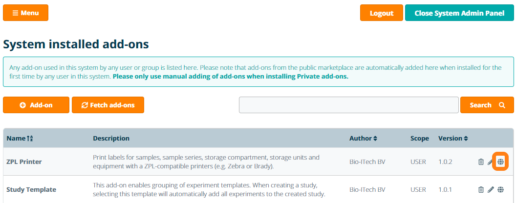 All add-ons installed in your organization's eLabJournal Private Cloud or On-Premises installation are only within your system installation. Optionally, you can make add-ons in your system public, thereby making them available for other systems to retrieve these add-ons. In the list of installed add-ons in your system, all with a globe icon indicated add-ons are public and therefore potentially available for other systems. Please note that the option to serve public add-ons requires activation of the corresponding setting and that any add-on must explicitly set to public