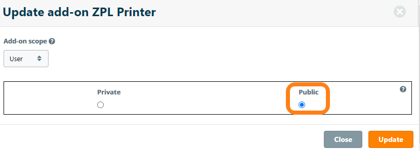 Click on the icon for the add-on to change the add-on from Private to public and click save or update to make this add-on available for other systems.