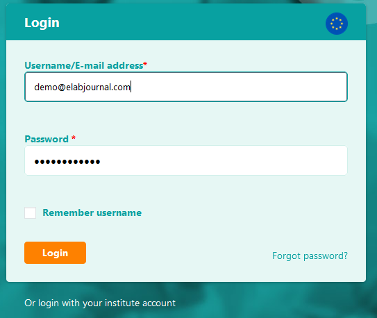Enter the email address used to register your account and your password to log in. Note: If organisation login is active for your organisation (SAML/LDAP/AD), please use the institute login option. Note that if your organisation has a dedicated installation of the eLabJournal Private Cloud or eLabJournal On-Premise, the links for the account registration and login is different. Please contact the key-user in your organisation for the correct URLs.