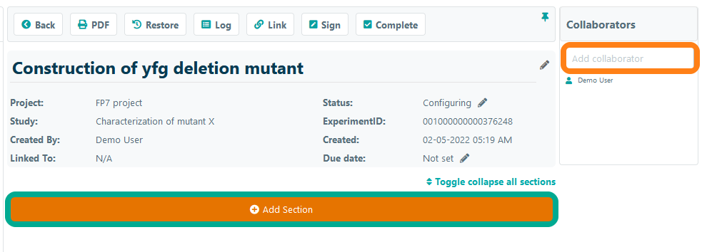 An experiment can be considered a blank page of a traditional handwritten lab notebook with added features. You can visually log data in the experiment by adding sections. There are sections to add text, samples, protocols, images, excel files, drawings, and raw data files. By adding collaborators to an experiment, you will be able to work on the experiment together with other members of your team and easily share lab results.