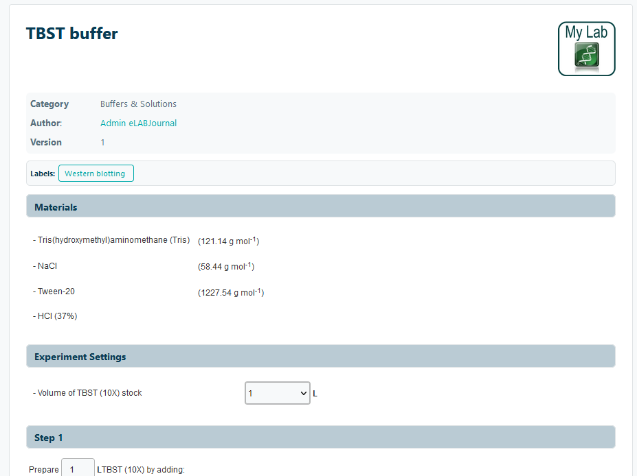 Within eLabJournal, you can set up protocols or standard operating procedures (SOPs). Protocols can be inserted to experiments to standardize how they should be carried out, thereby increasing their reproducibility. Protocols support dynamic fields (variables and formulas) that can be adjusted with just a few mouse-clicks when adding them to an experiment. Frequently used protocols are published in the Public repository in the Procedures menu and can be copied for personal use.