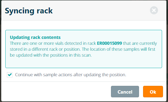Click Ok to sync the positions of the samples in scanned Rack with the positions of the samples in eLabJournal