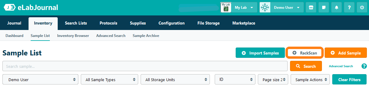 To add the vials scanned with RackScan to eLabJournal, navigate to Sample List in the Inventory menu and click the RackScan button to activate RackScan.
