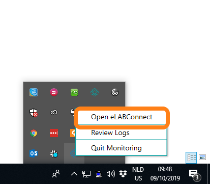 If eLabConnect does not open automatically, Open eLABConnect from your System Tray using the right-mouse click action on the eLabConnect icon.