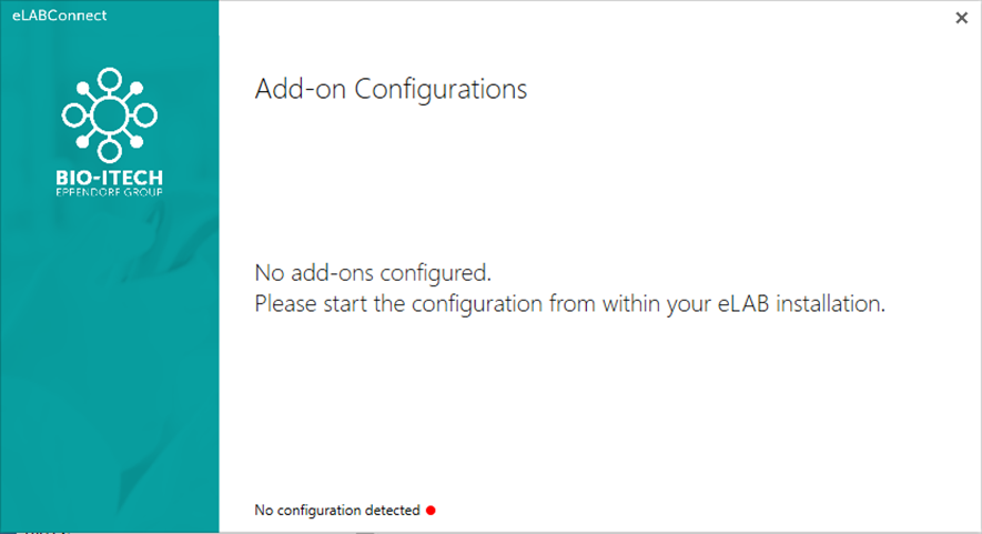 After running eLABConnect, eLABConnect is opened. In case you have not used eLabConnect before, eLabConnect will show No add-ons configured.