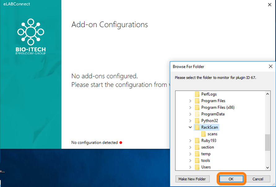 Select the folder that is set as the Default export directory in the RackScan Analyzer™ Software (see 3 - Configuring Eppendorf RackScan Analyzer™) or create a new folder. After selecting the folder RackScan add-on configuration will then be set-up.