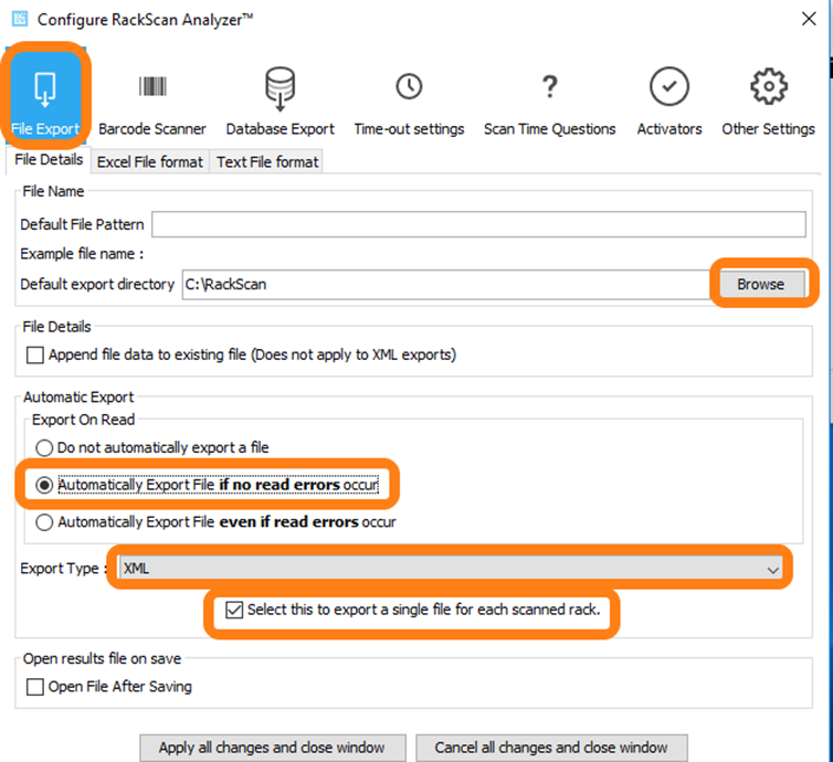 Once eLabConnect is configured, the next step is to set up the File Export settings in the RackScan Analyzer™ software