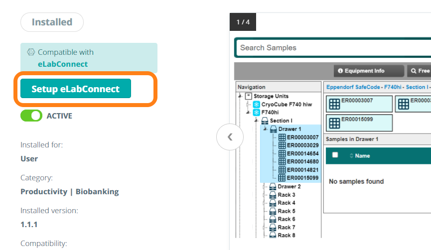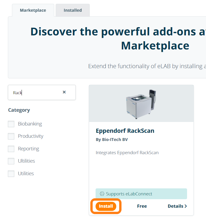 The Eppendorf RackScan integration is available as an add-on in eLabJournal. Navigate to Marketplace to install with the installation of the RackScan add-on.