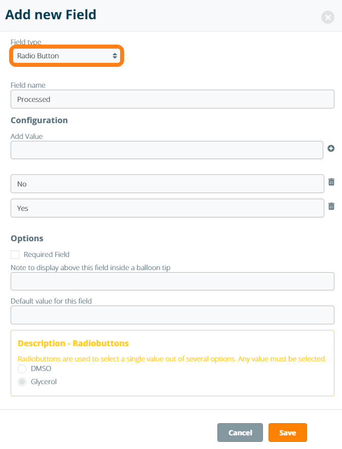 After saving the field, a set of radio buttons with fixed values is created for standardized data entry. Note: radio button fields can only accept one value at a time.