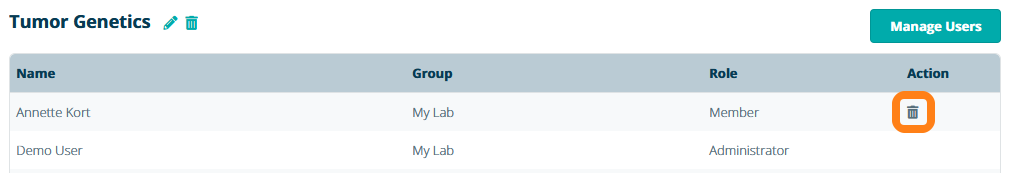 To remove users from a project group, click the Remove icon. Note: only a project group administrator may add or remove users from a project group.