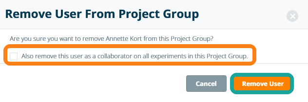Click Remove User to confirm this action. Once removed, the user will no longer be assigned as a collaborator on new experiments that are added to the project group. If you want to restrict access to all existing experiments in the project group, mark the option Remove this user as a collaborator on all existing experiments.