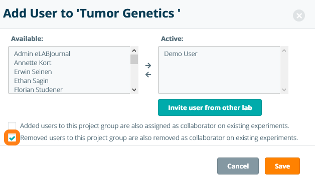 You can also use the Manage Users window to remove multiple users at the same time. In the pop-up window, you can select one or more active users and use the arrow icon to move them left into the Available list and out of the project group. Note that if you want to restrict access to all existing experiments in the project group, mark the option Removed user in this project group are also removed as collaborator on existing experiments