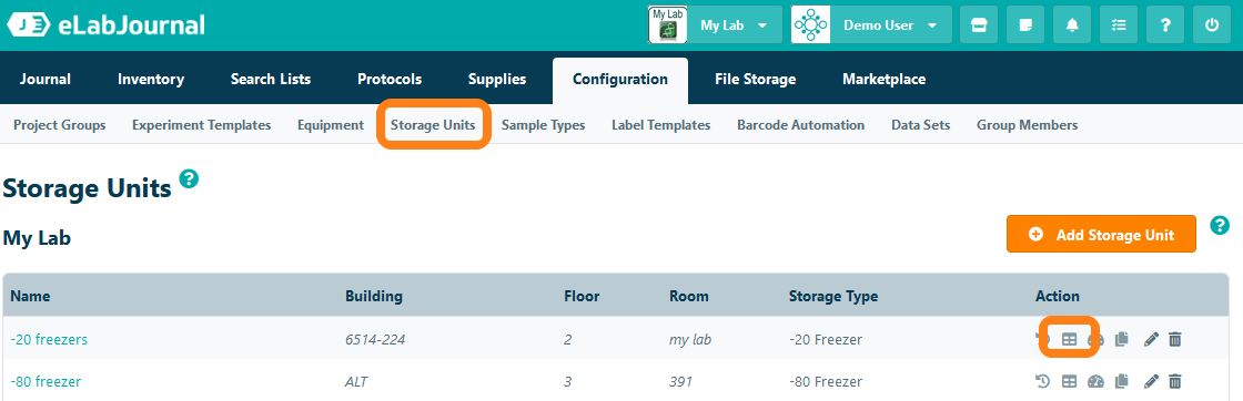 Within a storage unit, users can reserve compartments for a specific user or user role to store their samples. You can manage compartment reservation by navigating to Storage Units and clicking on the Reservation icon.