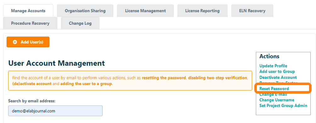 To manually reset the password for an account, navigate to Manage Accounts in the Organisation Admin. Find the account by entering the email address and click Reset Password. Note that in case of user authentication being handled by a federated organisation login (AD/LDAP/ADFS/SSO), the password reset is then not active.