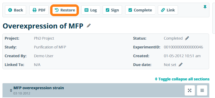 Sections that have been removed from an experiment in the ELN can be restored from the archive. Open the experiment and click Restore to access the archive.