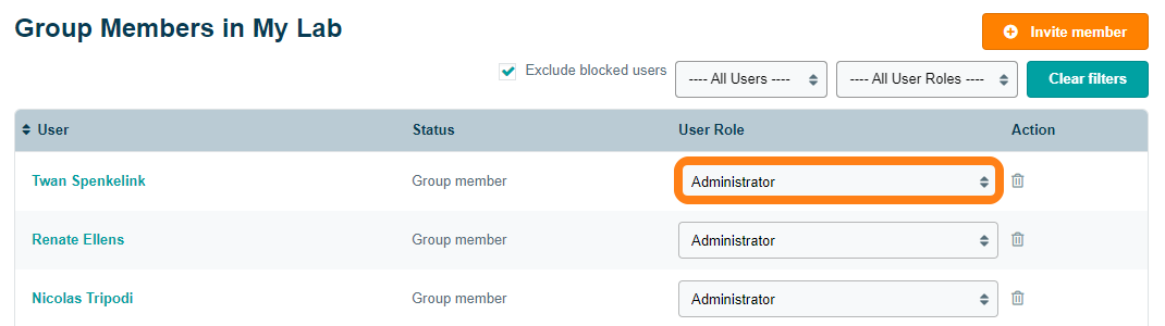 For each user, you can assign and change their ability to perform system actions by setting permissions. Each group has at least one user, the administrator, with full access rights. The administrator can change the permission settings of all lab members by updating the user role. Go to Configuration – Group Members to see a list of all lab members. Use the dropdown menu to change the user role of a lab member. Note: as an administrator you cannot change your own role as administrator. If you are the administrator and you want your permission levels to be changed, you should first promote one of the other lab members to the administrator role and ask the new administrator to change your role.