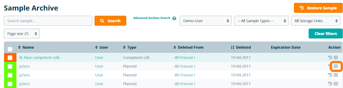 Samples that have been removed from the lab inventory are stored to the Sample Archive. Navigate to Sample Archive under the Inventory tab to view all samples that were previously stored in the lab's inventory. This ensures that any information about archived sample that might be linked in experiments will remain available.
