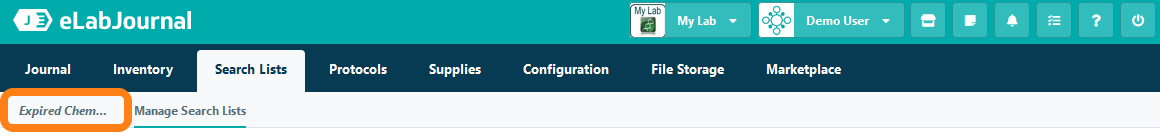 The Search Lists tab will become available in the toolbar to the user's saved searches. Click on a shortcut to run a search of the inventory with the saved search criteria.