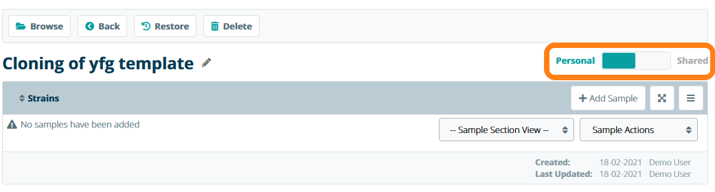 When an Experiment Template is created, it will only be available for personal use by default. To share an experiment template with other lab members, open the Experiment Templates page in the Configuration menu and open the template page. Click the toggle in the upper-right corner of the page to change the template sharing setting from Personal to Shared.