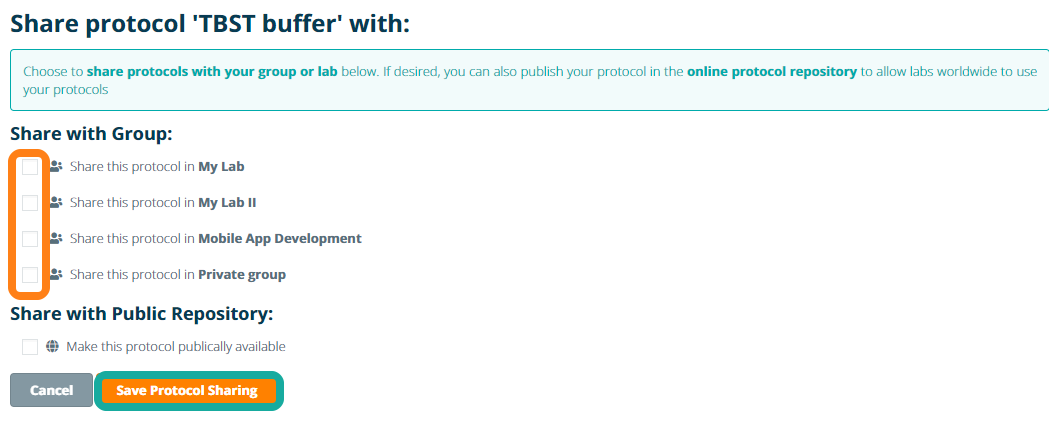 Protocols can be shared with one or more groups by selecting the corresponding checkboxes. The protocol will be available in the selected groups and accessible for other group members to use in their experiments. When sharing a protocol, users can also choose to copy the existing labels to the group where the protocol is shared.