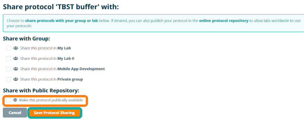 Protocols can also be added to the publicly accessible repository by selecting the corresponding option. Any protocol shared in the public repository will be available for all eLabNext users within the system. Note: all publicly shared protocols within the Shared Cloud are reviewed and approved by the eLabNext team prior to their release into the public repository.