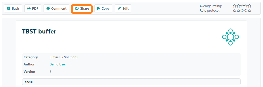 Protocols can be shared to make them available to other members in the lab. To share a protocol, open the protocol's details page and click the Share button.