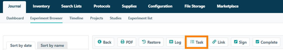 For customers with eLabJournal, users can additionally create tasks that are associated with a specific experiment. To create a task for an experiment, navigate to the experiment page and click the Task button. Once the task has been created, a link to the experiment will be listed in the Associated with column on the Tasks panel.