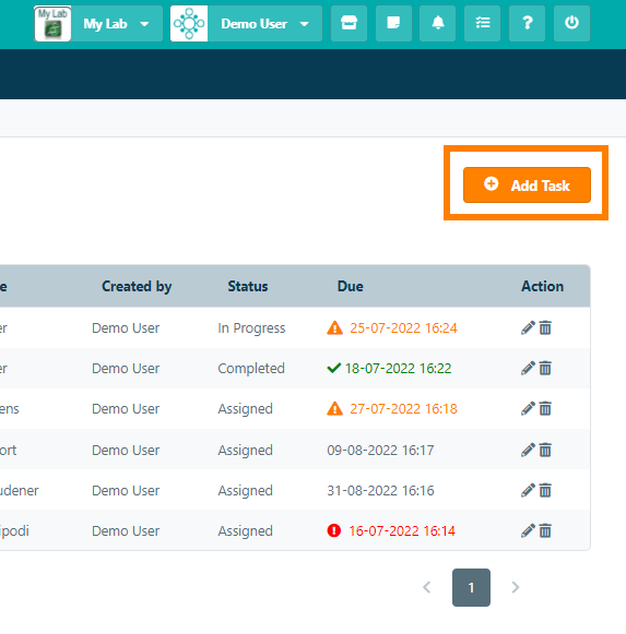Streamline processes within your lab with Tasks. With this add-on, you can create and assign tasks to users as well as track their status. Users automatically receive a notification when a task is assigned to them. Assigned tasks are listed on the dashboard to raise awareness for any pending tasks. Note: the current iteration of Tasks does not support audit trails.