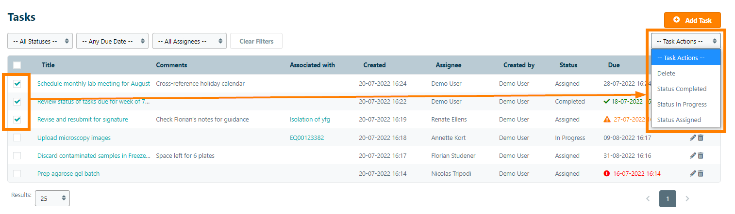 The status field can also be updated for multiple tasks using the Bulk Action dropdown. Mark the checkboxes for the tasks you want to update to reveal Bulk Actions dropdown. Choose the desired status from the dropdown to update the status of the selected tasks.