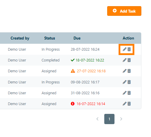 To edit information for an existing task, users can select the icons listed in the Action column of the task list.