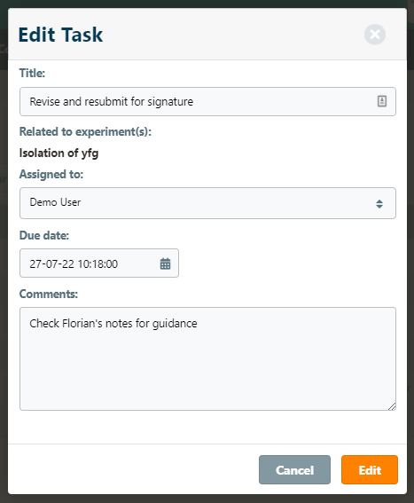 Click the Edit icon to open the Edit Task window. Users can update the title, assign the task to a new user, change the due date, or edit the comments section. Click the Edit button to apply these changes.
