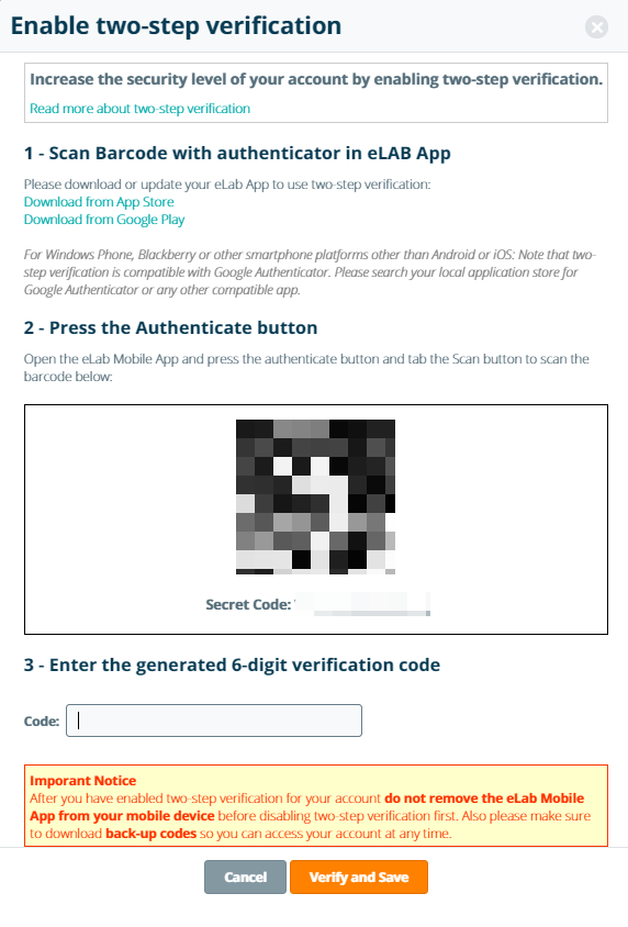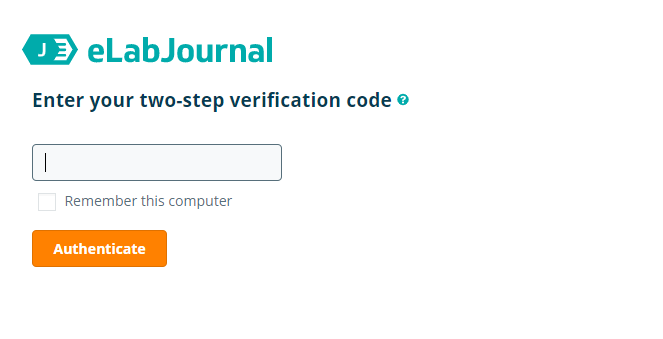 In the pop-up menu, you can now verify your device to generate a two-factor code. You can get this code by following the instructions below. Please note that after enabling two-step verification, you will always need your mobile device to generate a new two-factor code when logging into eLabJournal. If you do not have this code, you may no longer be able to directly access your account and data.