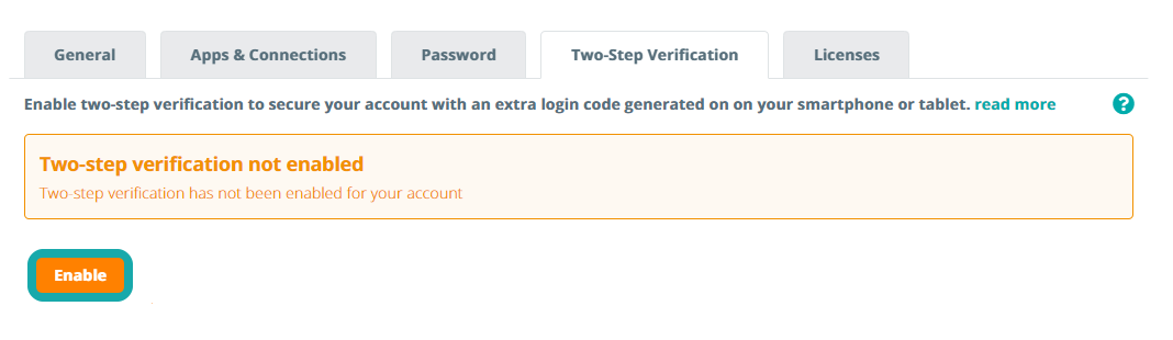 Enabling two-step verification for your account introduces a second layer of security to protect your account. With two-step verification active, an additional 6-digit code is required in order to log into the application. This unique code is generated on your smartphone and changes every 60 seconds. First, you need to activate the two-step verification setting by clicking Enable.